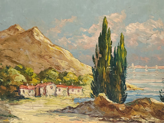 Red Roofs by the Sea Vintage French Painting