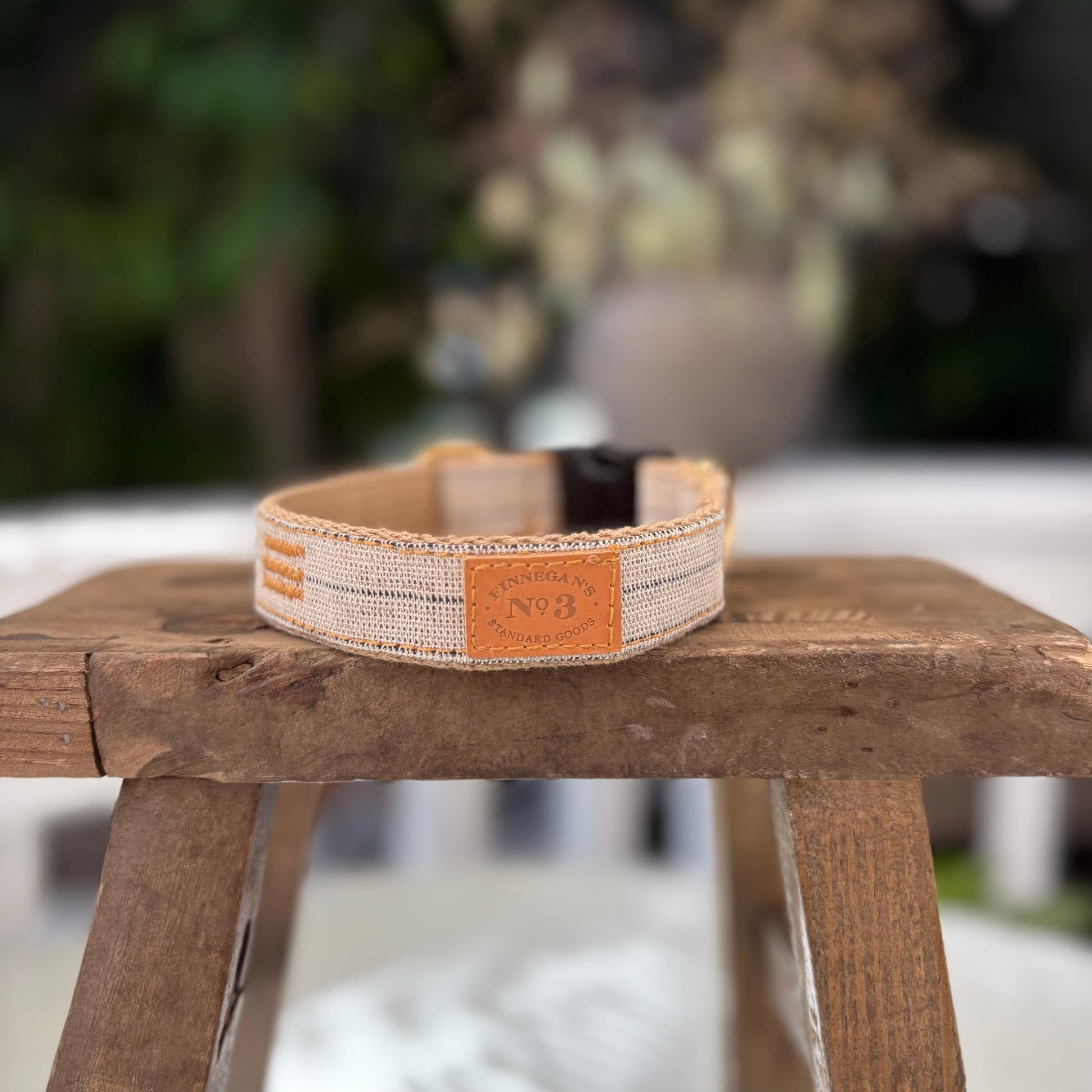 Made on lightweight soft cotton webbing, using different fabrications, sourced from all over the world, accompanied by solid brass fittings and an adjustable collar...handmade and assembled in San Francisco, California.