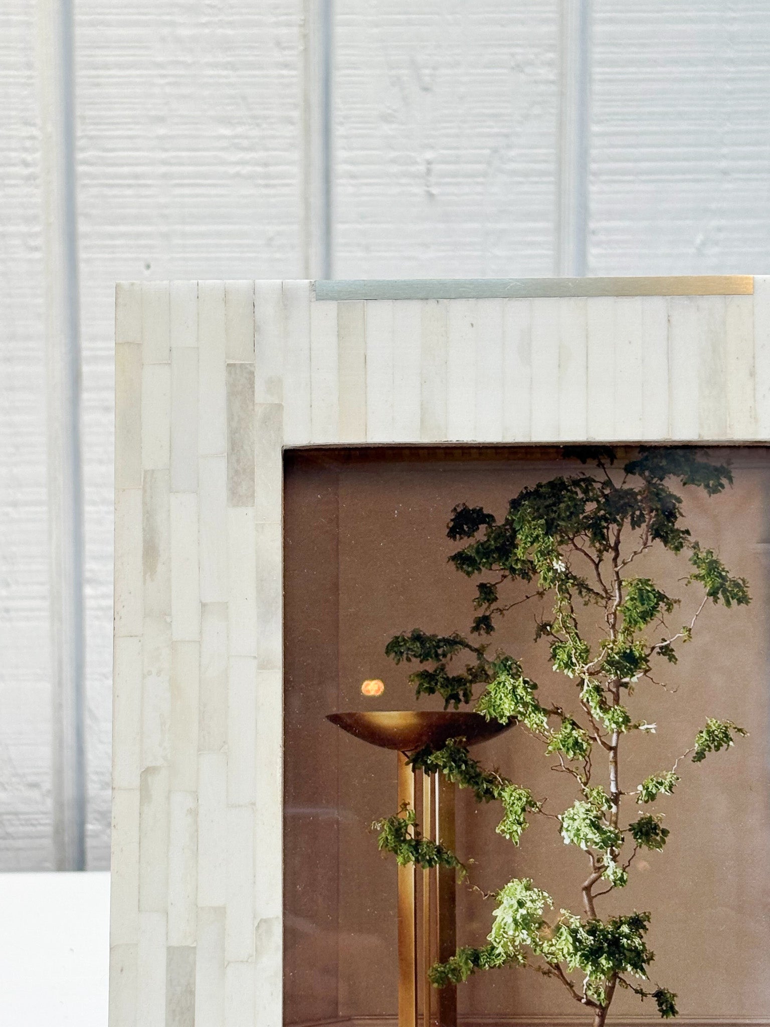 Ethically sourced bone tile and brass accents, hand crafted and thoughtfully designed for stylish display with inlaid bone tile accented by slim, gold finish brass bars at top and bottom.