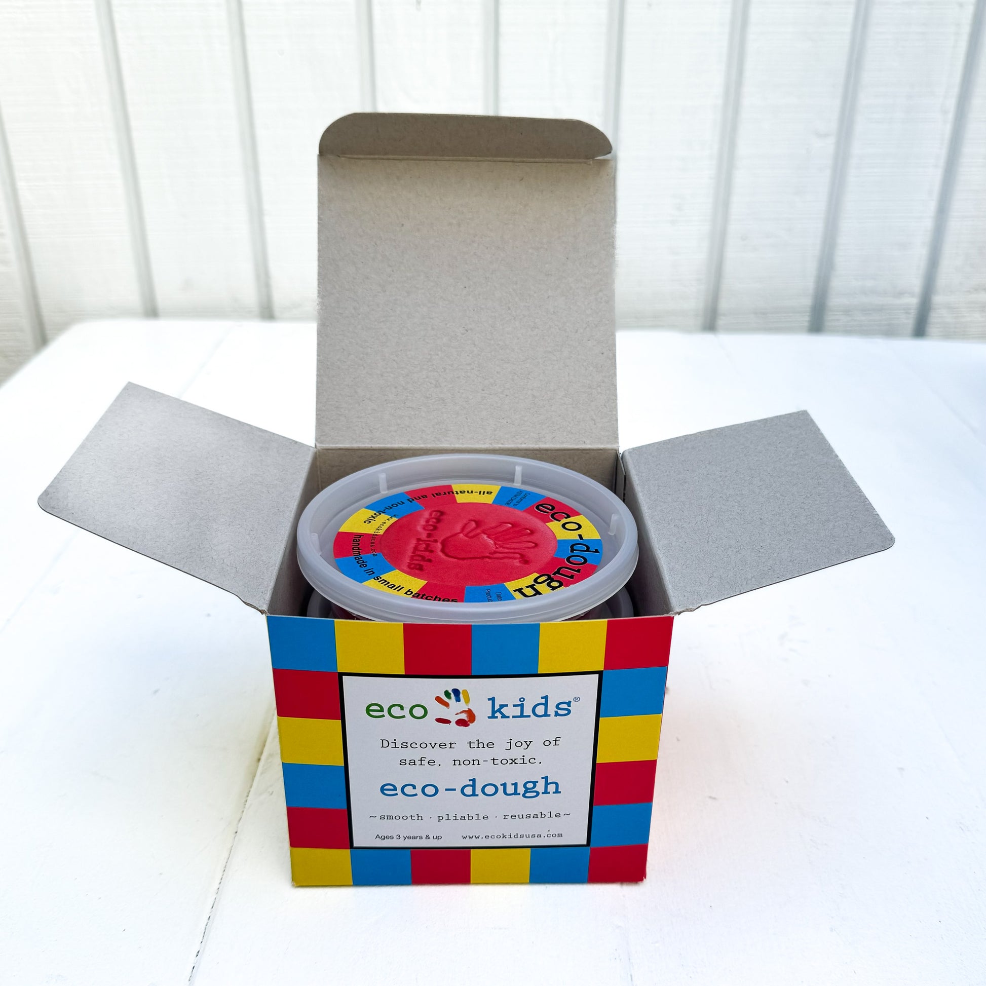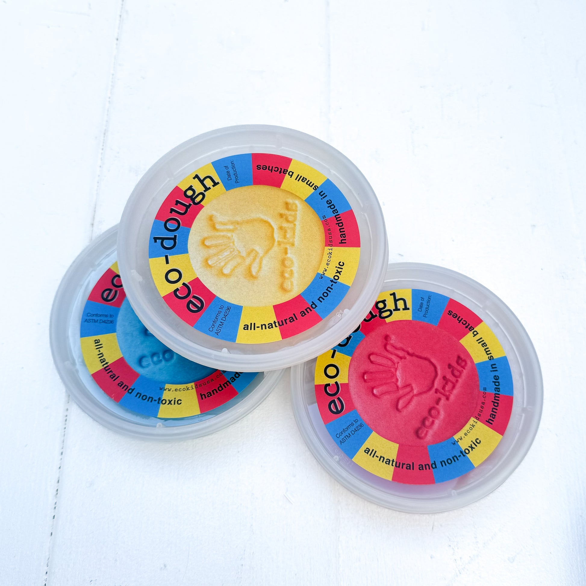 Our eco-dough is hand made in small batches using natural, non-toxic ingredients. It provides hours of artistic exploration as well as engaging children with an opportunity to learn the basics of color theory by experimenting with mixing and blending the primary colors included in this assortment