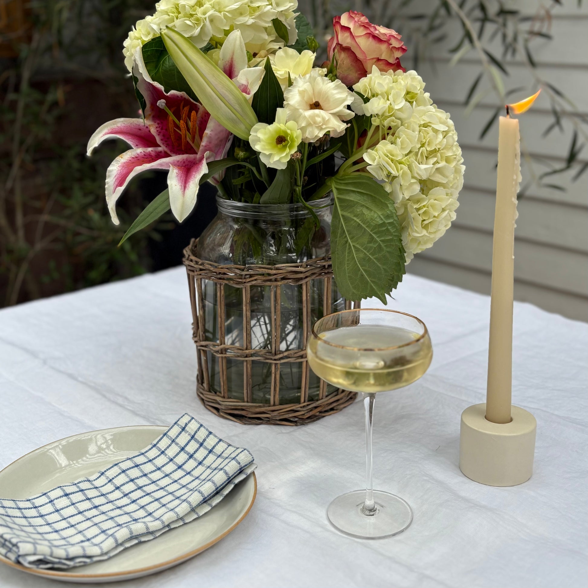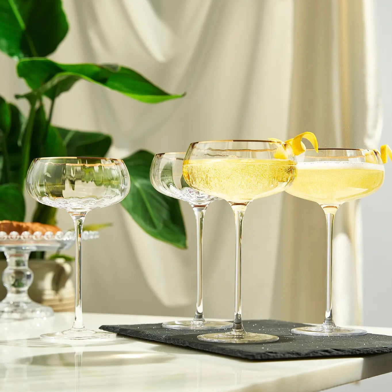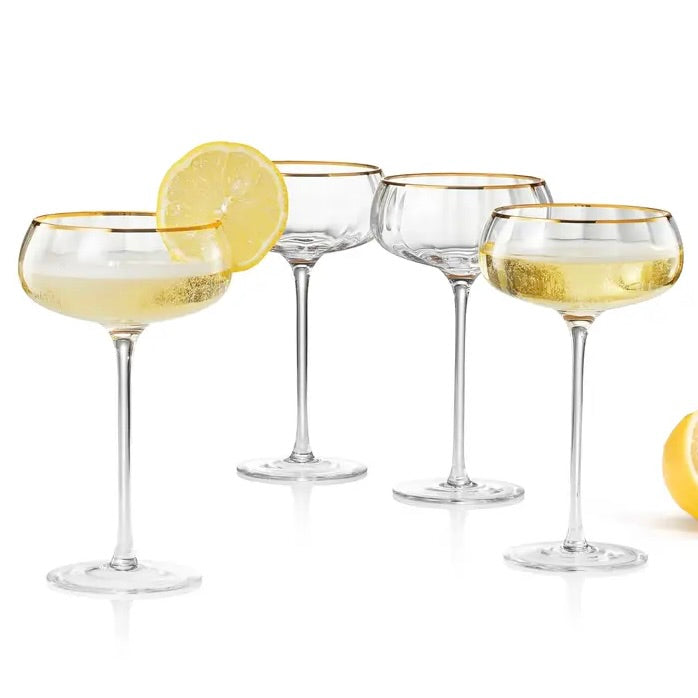 These 8.1-ounce coupe glasses are designed to serve a wide array of cocktails, from champagne and cosmopolitans to sidecars and martinis. Their vintage-inspired ribbed design, combined with a delicate gold rim, creates a stunning visual presentation that is perfect for elevating your next housewarming party, fall gathering, or holiday celebration.