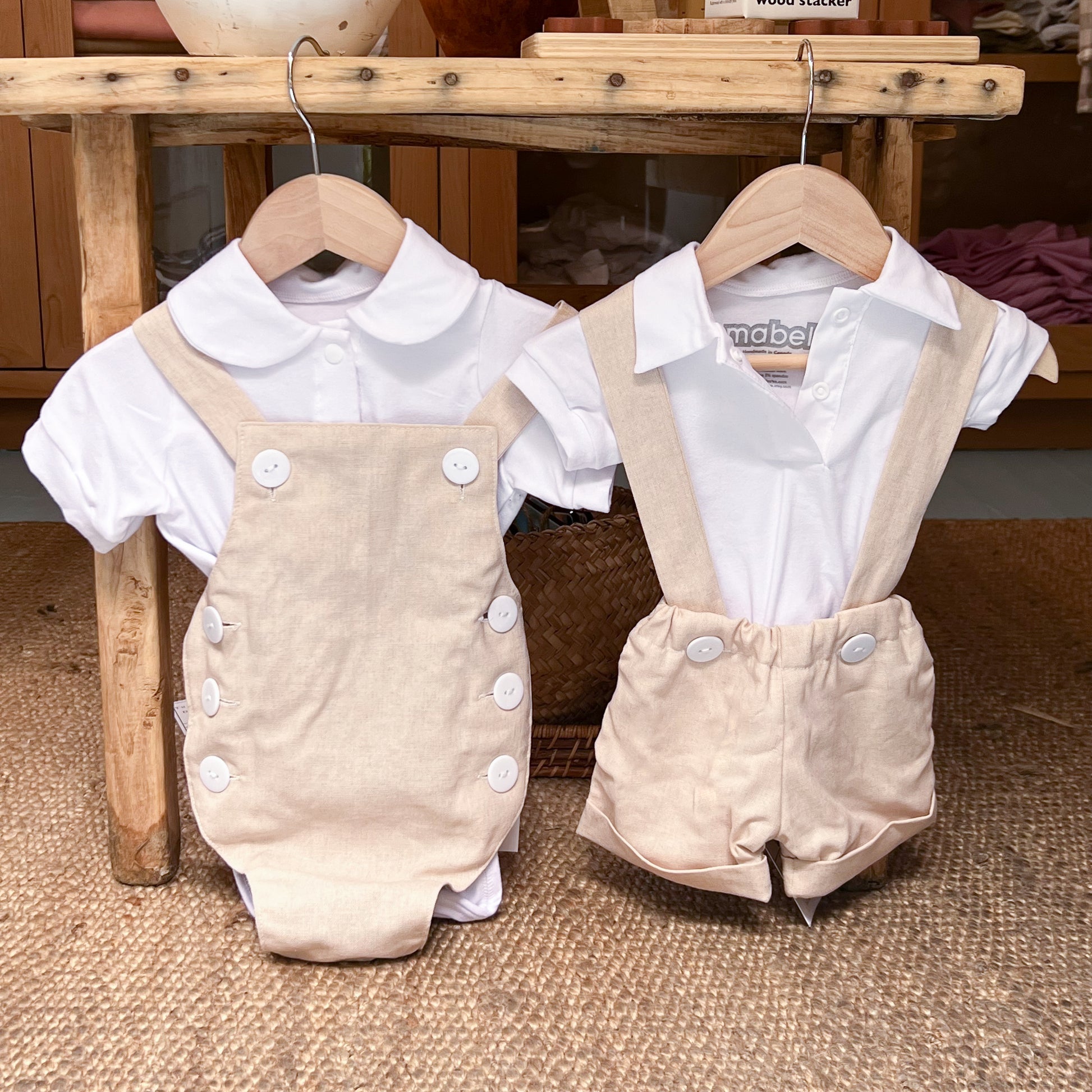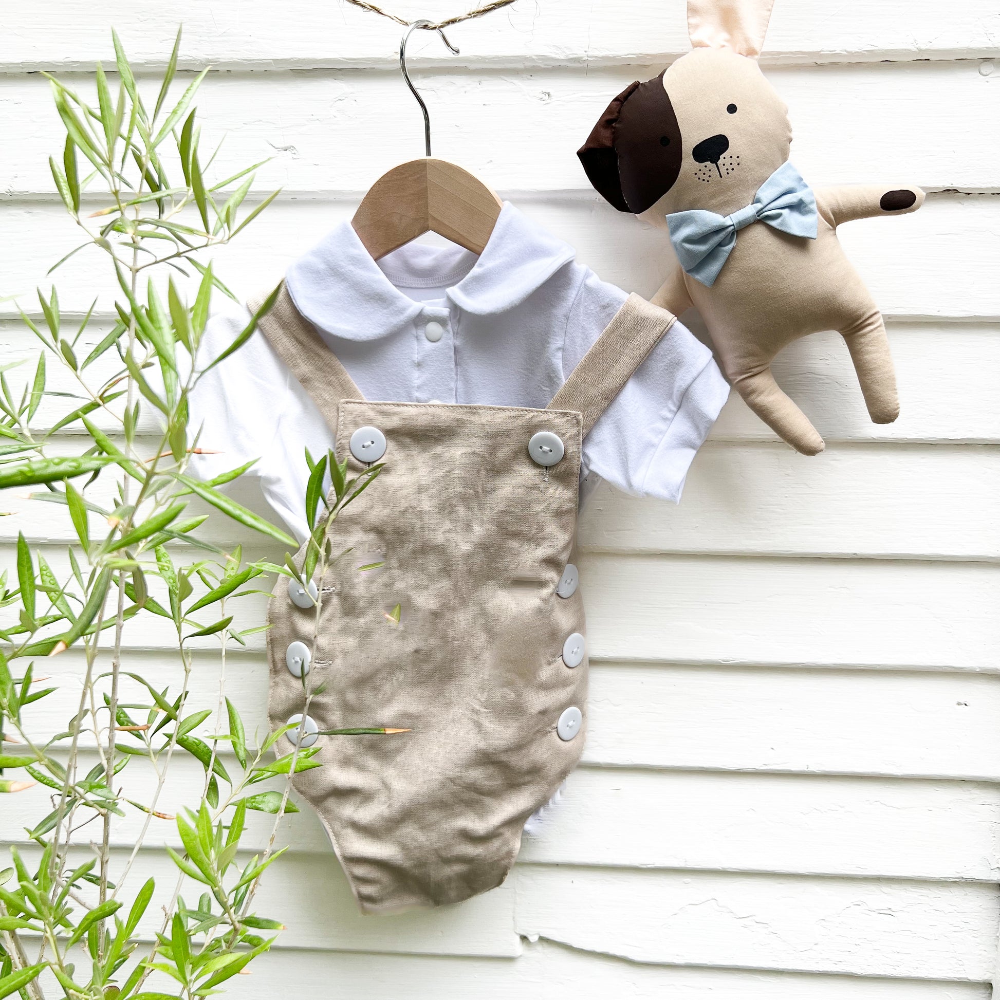 This retro baby romper is made of a natural, tan linen and lined in cotton. Waist and leg openings are elasticized for comfort and good fit. Straps have two buttons so that you can lengthen or shorten as needed.