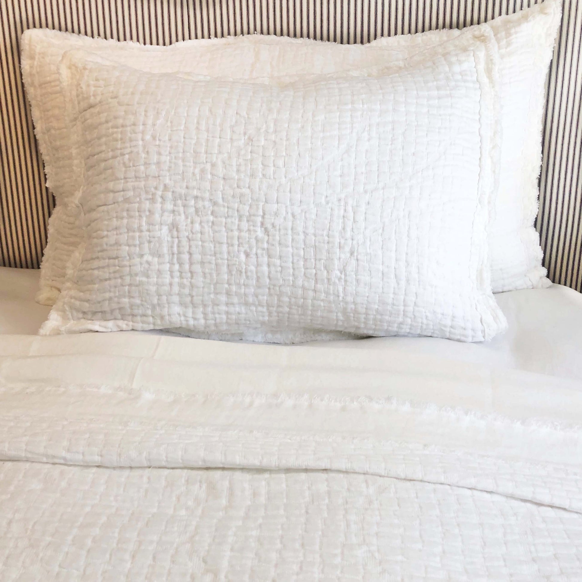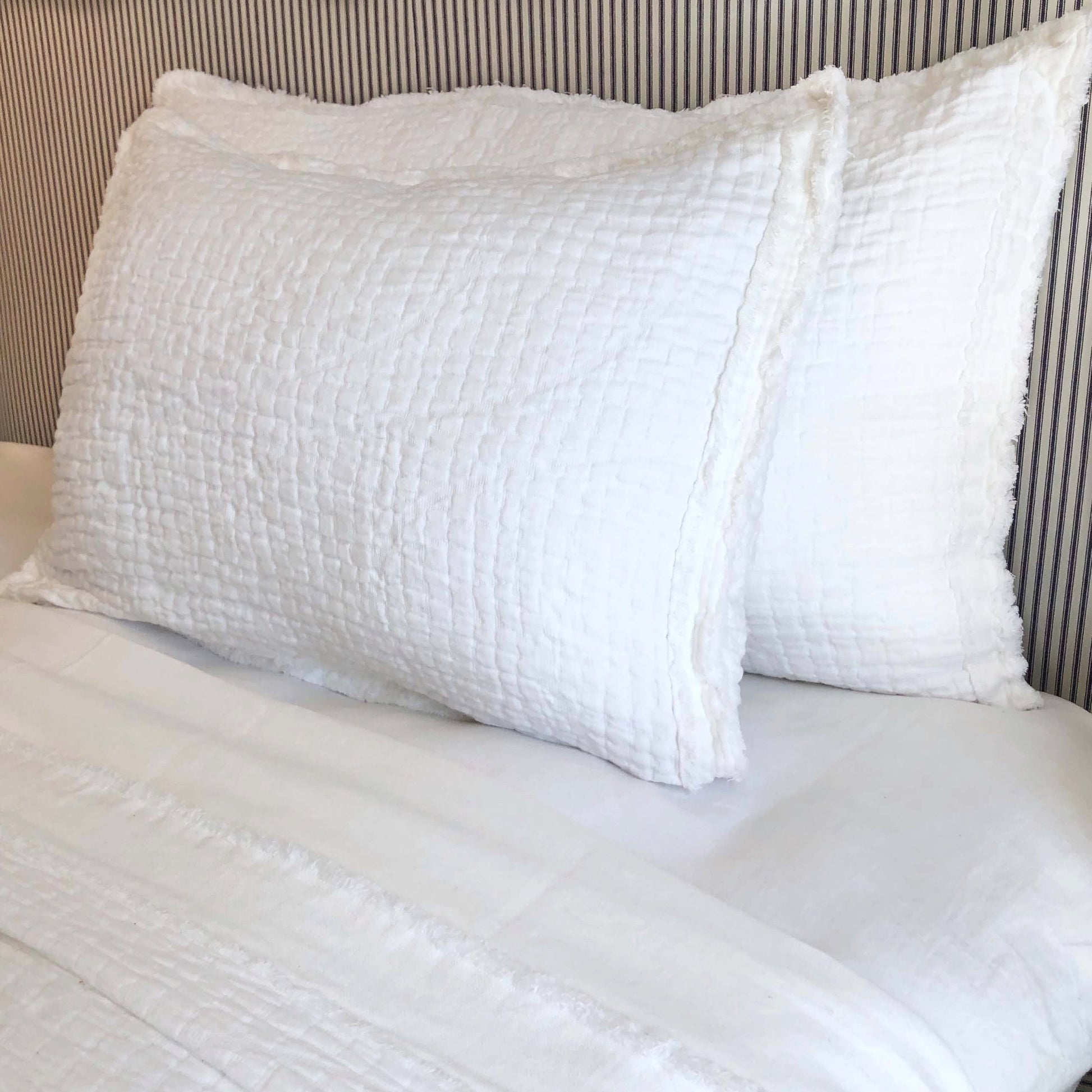 Part of our Merci Collection, these shams are so big and comfortable it will make sitting up to eat breakfast in bed that much more luxurious....Pair them with the Merci Coverlet and throw....Merci Shams are finished with a stone washed process, which gives them stain resistant properties and makes them completely safe to wash at home. We recommend washing weekly in cool water and in your dryer at low heat.
