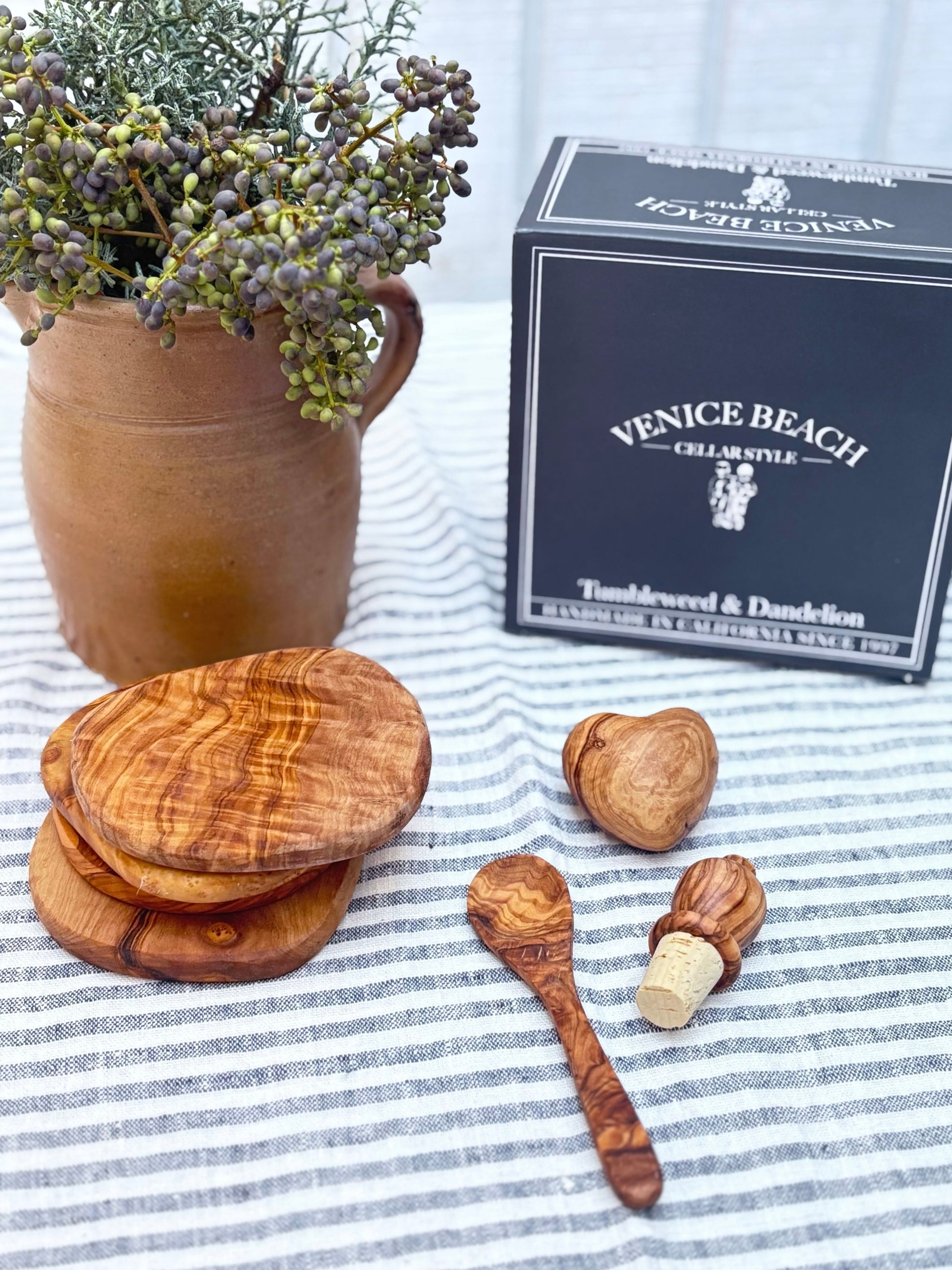 Thoughtful. Functional. Timeless. The perfect small gesture with a big heart, this Hostess Gift Set is a charming and practical way to show appreciation. Packaged in a branded corrugated box, this collection of handcrafted olivewood essentials brings warmth and elegance to any home. The set includes a delicate 5" olivewood spoon, a bottle stopper to elevate wine nights, a set of four coasters to protect surfaces in style, and a mini heart token, symbolizing heartfelt hospitality. Whether for a dinner party, a housewarming, or just because—this set is a timeless way to say thank you.
