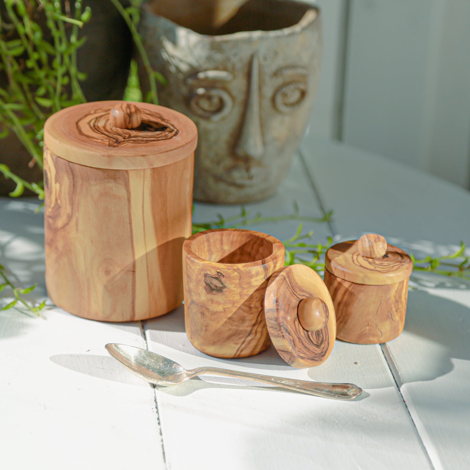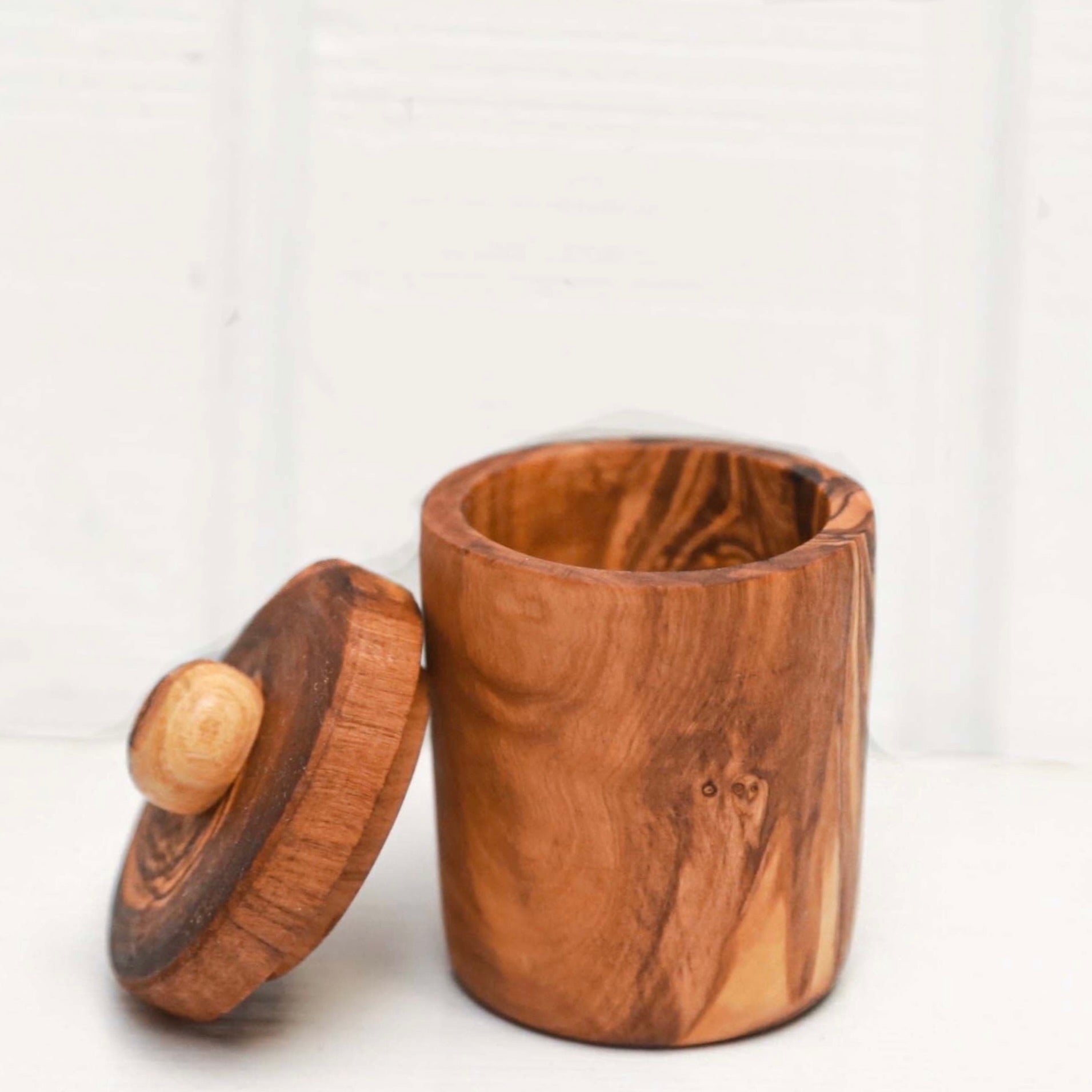 The streamlined design of these olive wood jars are the perfect size for use in the kitchen or the bathroom.