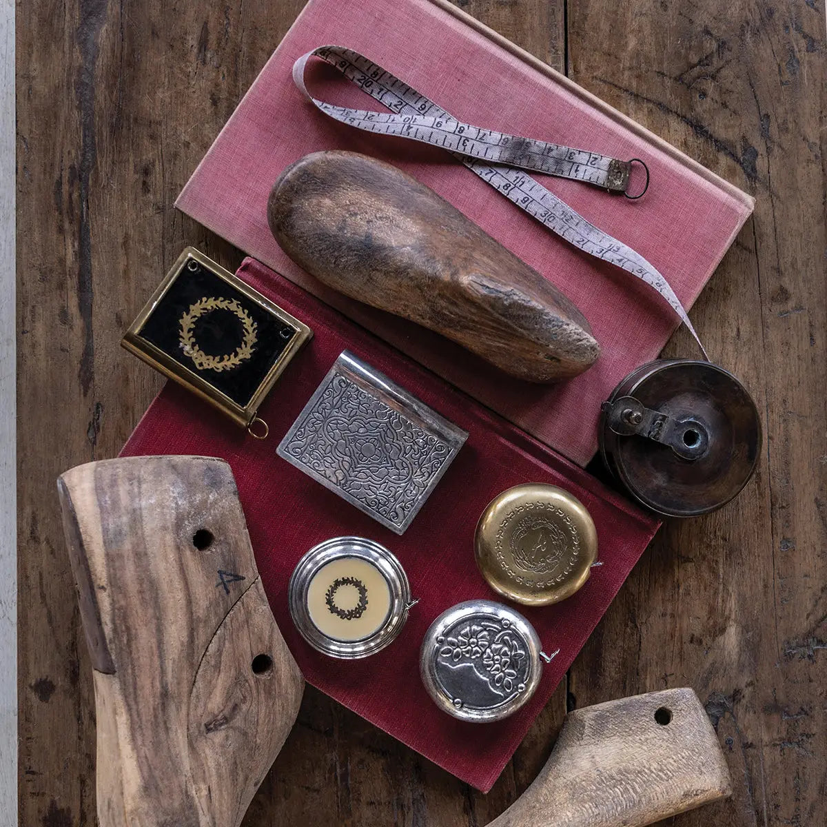 The Surveyors Tape Measure comes in a simple metal casing. The round case is faux aged for an antique look and tucks easily into a pocket or purse.