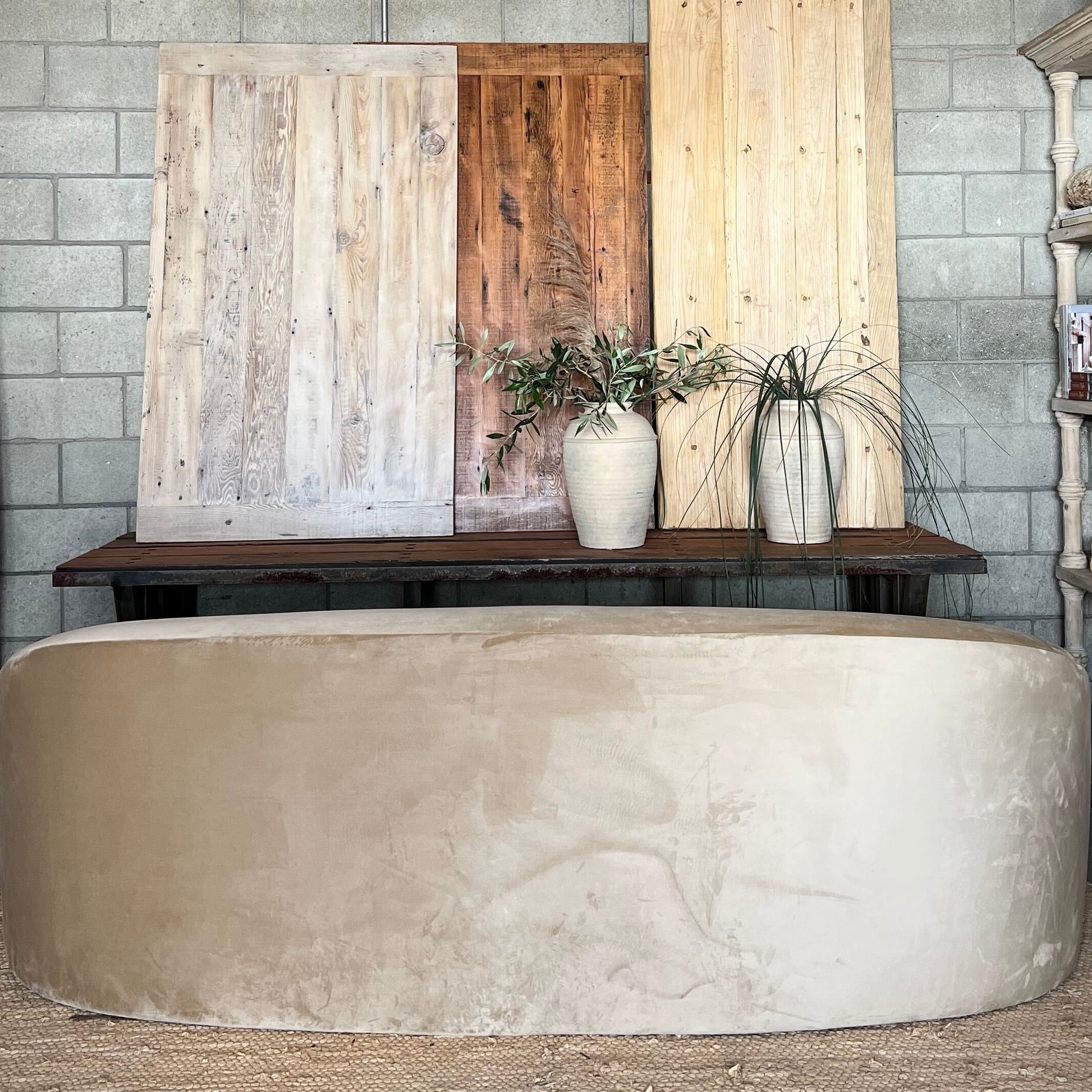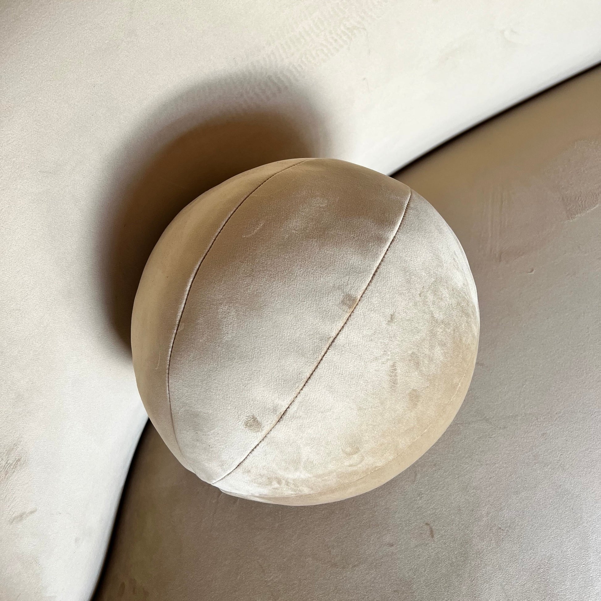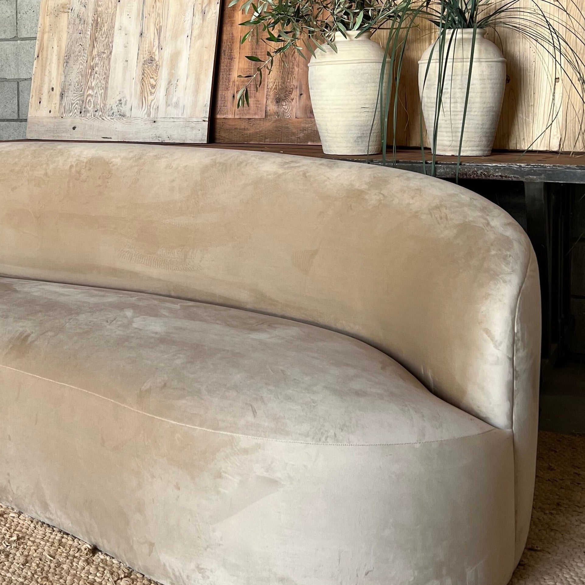 We love this sofa because it can be dressed up or down but it's always glamorous...Curved and comfortable in a brushed camel velvet