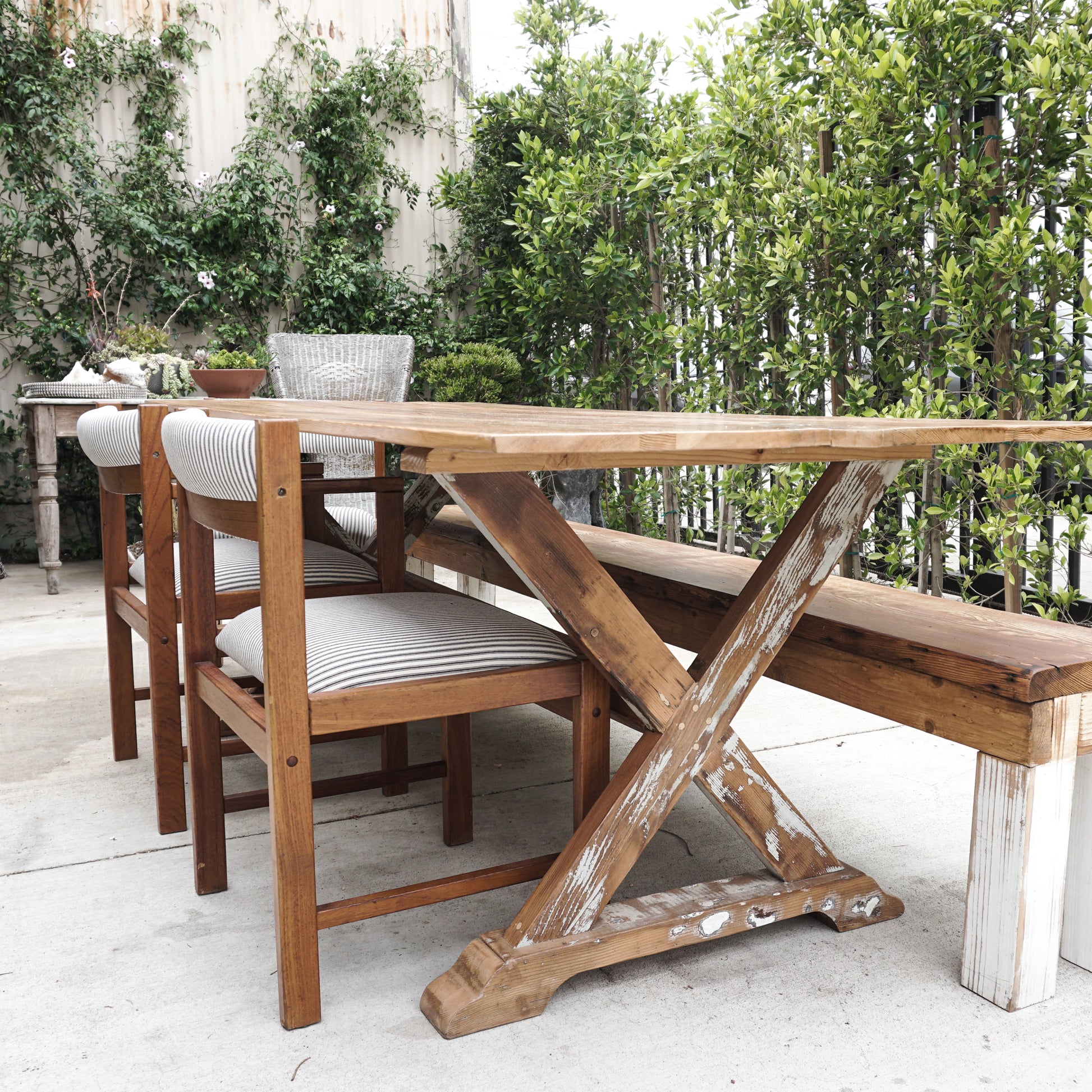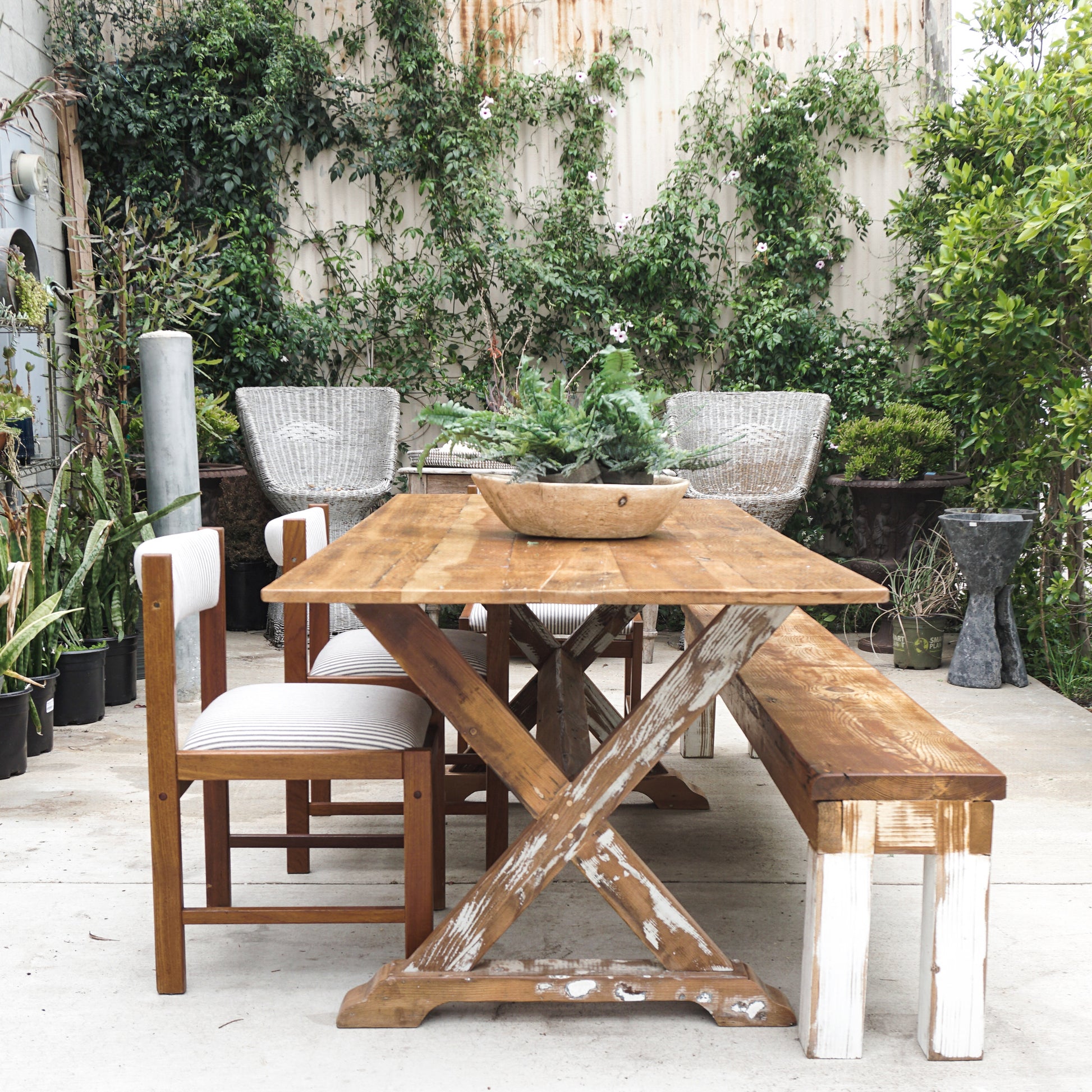 Custom built with reclaimed wood, The Hamptons table is a farmhouse style beauty that is waiting to grace your kitchen or dining room. Polished wood top with distressed "X" shape legs, it evokes the feeling of vintage rustic with a fresh spin. Pair it with chairs, benches or a combination of both to complete the look!