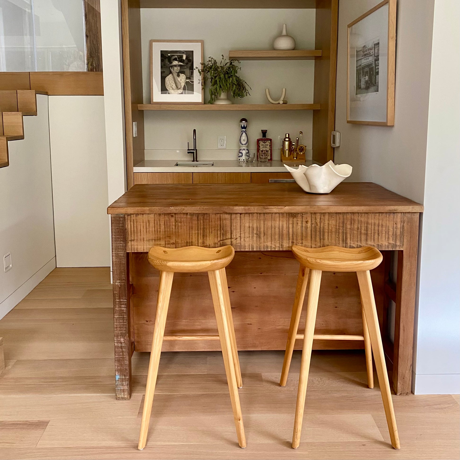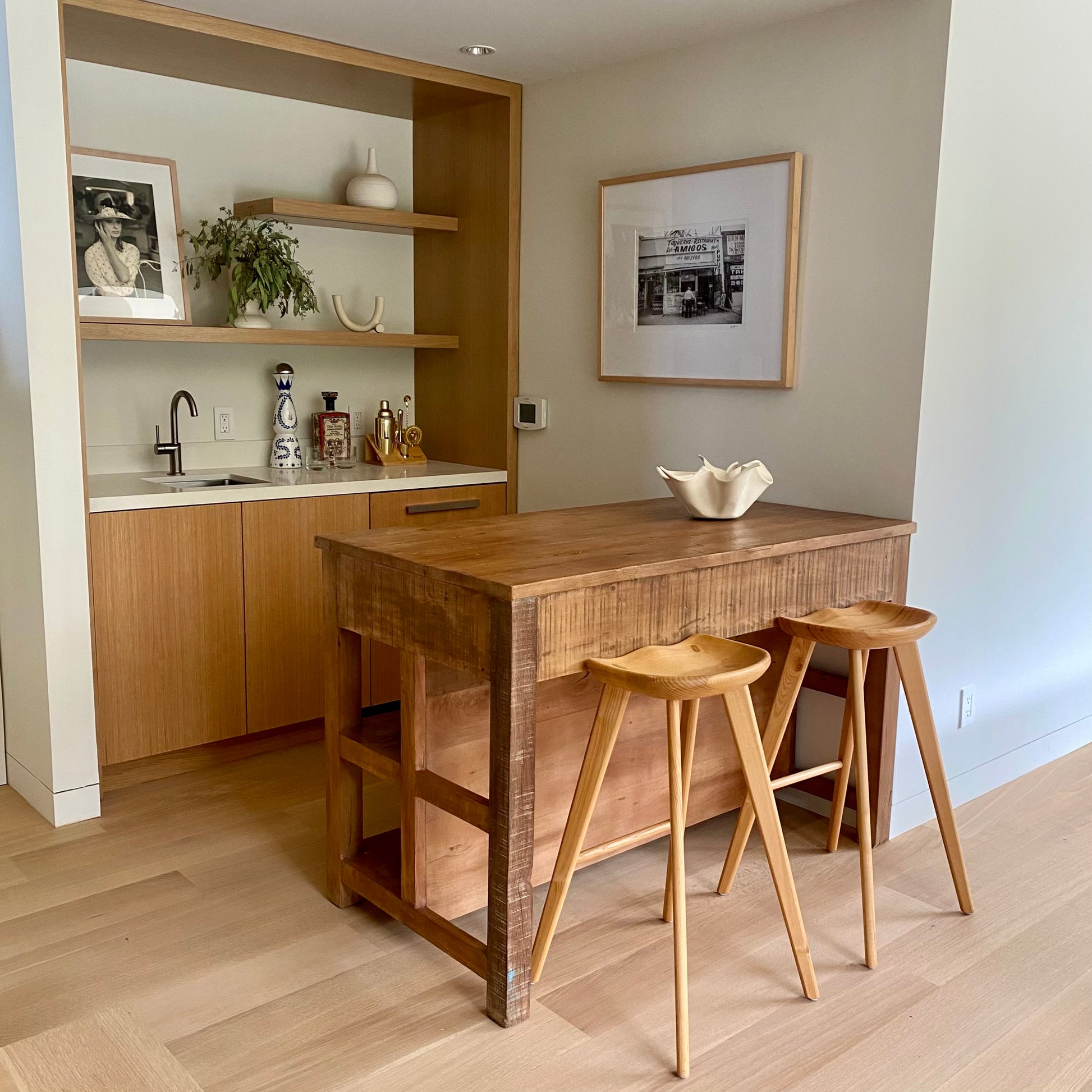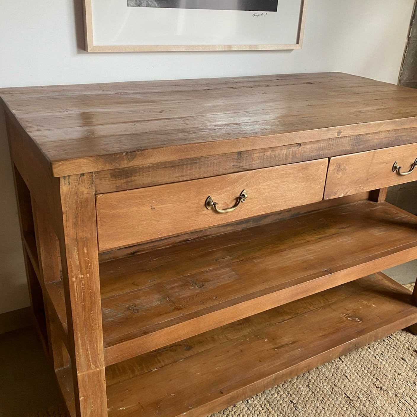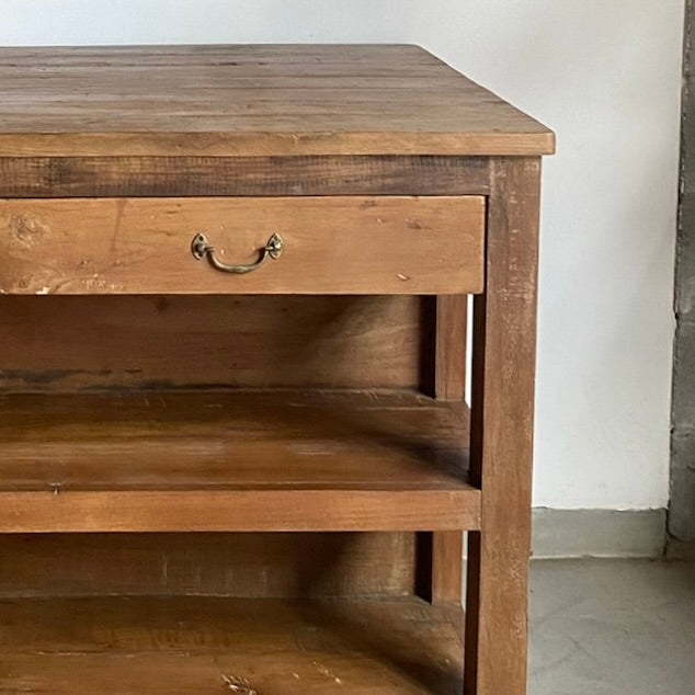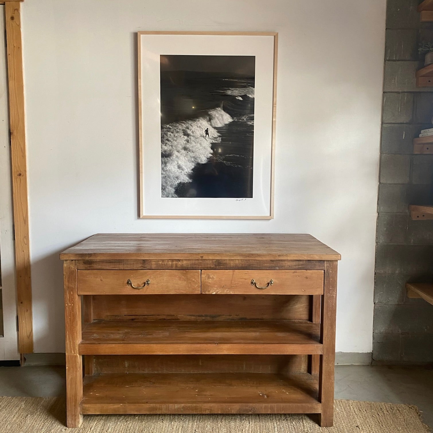 *The Lake House Island is the perfect blend of function and sustainable style. It is rectangular and fits two counter stools on one side. The other side of the counter is designed to provide extra storage and includes two drawers and an open shelf. Made from hand-picked reclaimed factory beams and floor planks, the lake House Island is an eco-friendly and moveable kitchen accent.